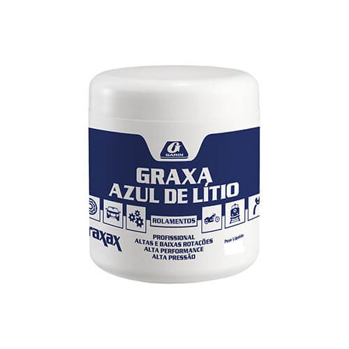 Aplicação: Graxa Azul de Lítio Graxax foi especialmente desenvolvida para lubrificação de forma geral em rolamentos de esferas ou cilindros de baixa e alta rotação, como: molinetes, mancais lisos, bicicletas, motos, engrenagens, homocinéticas, roletes, mancais, correntes em geral, autos, caminhões, tratores pesados, etc.