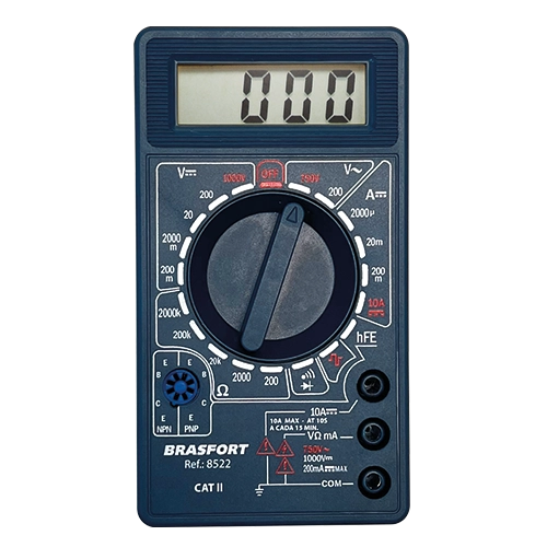 Medição de corrente contínua, tensão alternada e contínua, resistência elétrica, polarização de transistor e teste de continuidade;